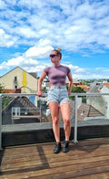 Den sidder meget pænt på kroppen, og er perfekt her om sommeren! Jeg vipper normalt mellem xs og s, jeg købte denne i s og den sad rigtig godt! Ikke for stram og ikke for løs! Lilla farven er også så fin😍 Jeg anbefaler denne, hvis du leder efter en ny træningst-shirt! (Shortsen på billedet hedder scrunch shorts!)